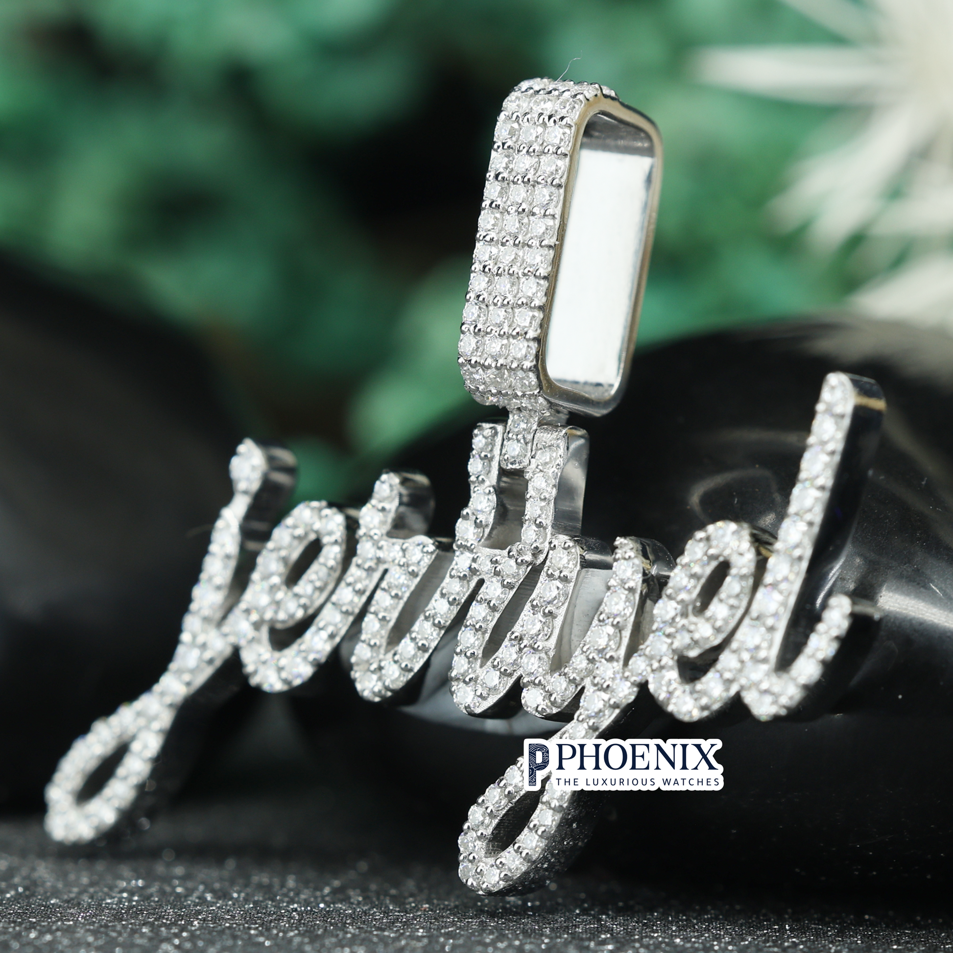 Personalize your style with this dazzling Custom Iced Out Jerryel Name Pendant, the ultimate piece of letter custom jewellery pendants design from Phoenix Enterprise. This personalized charm, sized 21 x 37 mm, is covered with 166 Certified Moissanite Diamond stones, totaling 1 Carat of stunning brilliance. We guarantee authentic diamond jewelry with flawless VVS1 Clarity and colorless D - E Diamond Color. Every gem is tester passed diamonds, confirming that you are investing in top-tier certified moissanite diamond jewellery and the finest Moissanite diamond jeweley available in the custom jewelry market.
